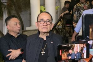 Ruhut Sitompul, pengacara senior, tak kuasa menahan duka saat melayat ke rumah duka Hotma Sitompul di Jakarta Selatan, Rabu (16/4/2025)...